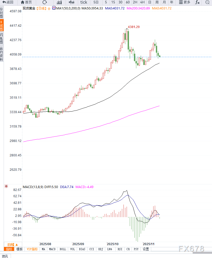 短期均线呈现空头排列,MACD动能柱持续萎缩,暗示下行动能仍在释放。当前金价在4030美元附近获得有限支撑,但技术上关键支撑位仍在3980—4000美元区间,若有效跌破该区间,可能进一步下探前期低位。