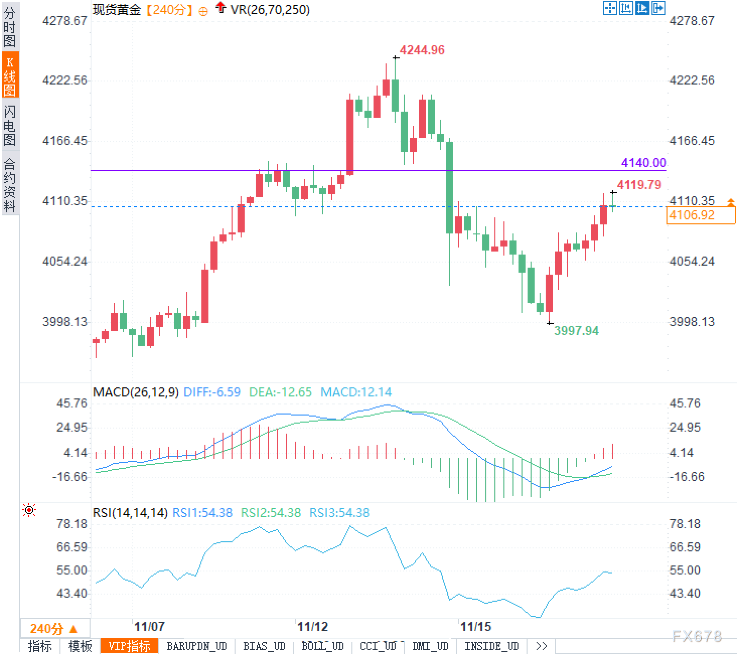 4小时级别来看,现货黄金自前低3997.94一线启稳后出现阶梯式反弹,目前价格在4110美元附近运行,基本收复前一轮急跌的部分失地。图中可见,上方4140附近叠加前期密集成交区及4244.96高点形成的下降压力带,构成短期重要阻力区域。