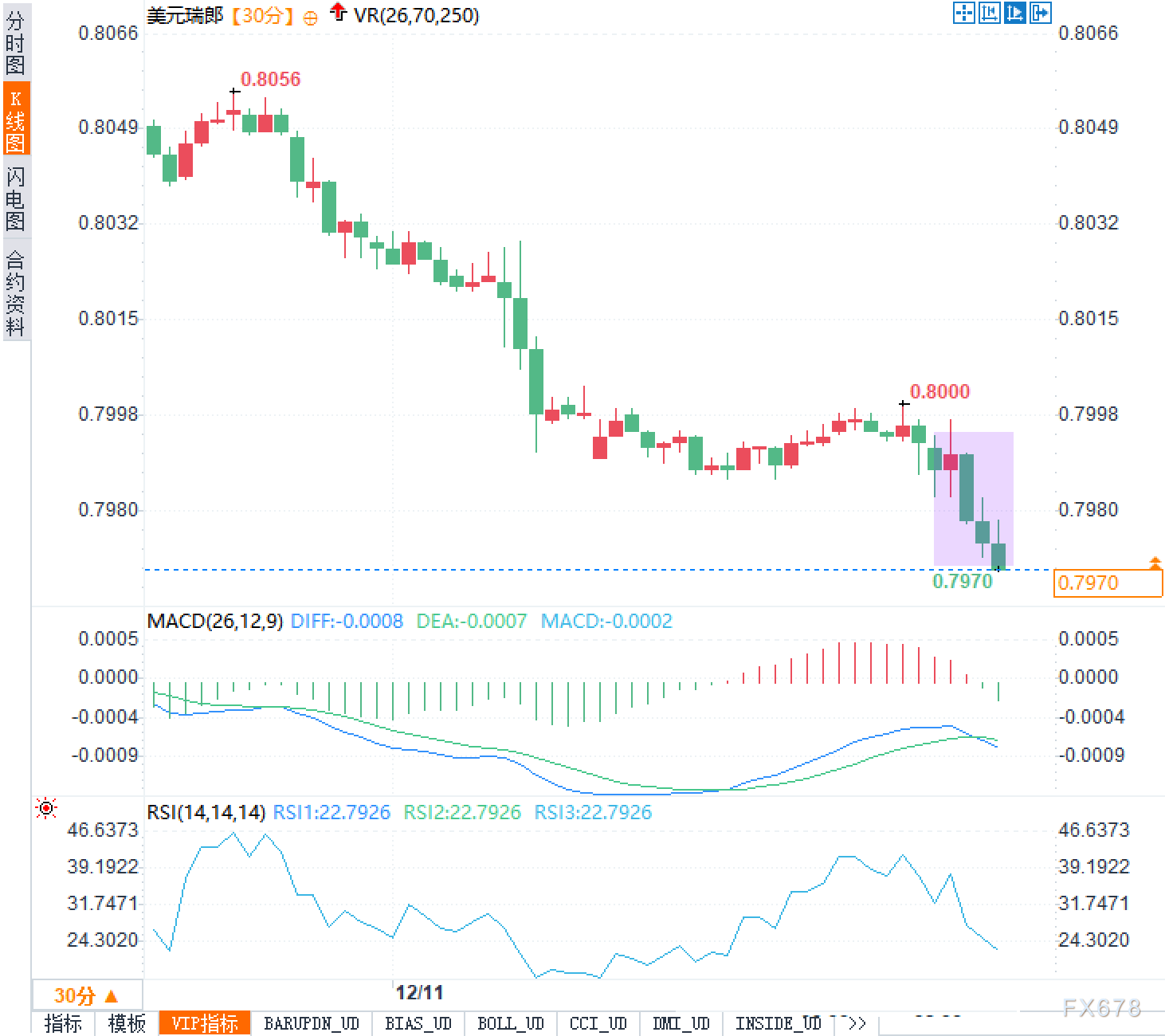 汇通财经APP讯——12月11日,星期四。在全球主要央行货币政策分化持续演绎的背景下,交易员的视线落在瑞士央行的年度收官利率决议之上。美元兑瑞郎汇价在过去3个交易日累计下跌近1%,目前欧洲时段交投于0.7970附近,逼近3周以来的低位水平。市场正处于对瑞士央行政策立场与美联储宽松路径再评估的微妙阶段。