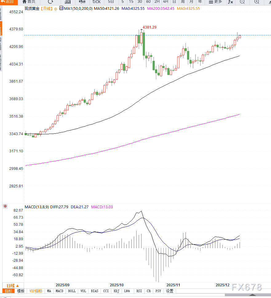 汇通财经APP讯——周一亚洲交易时段,国际金价(XAU/USD)延续强势,吸引逢低买盘并上探至4326美元附近,创下10月21日以来新高。