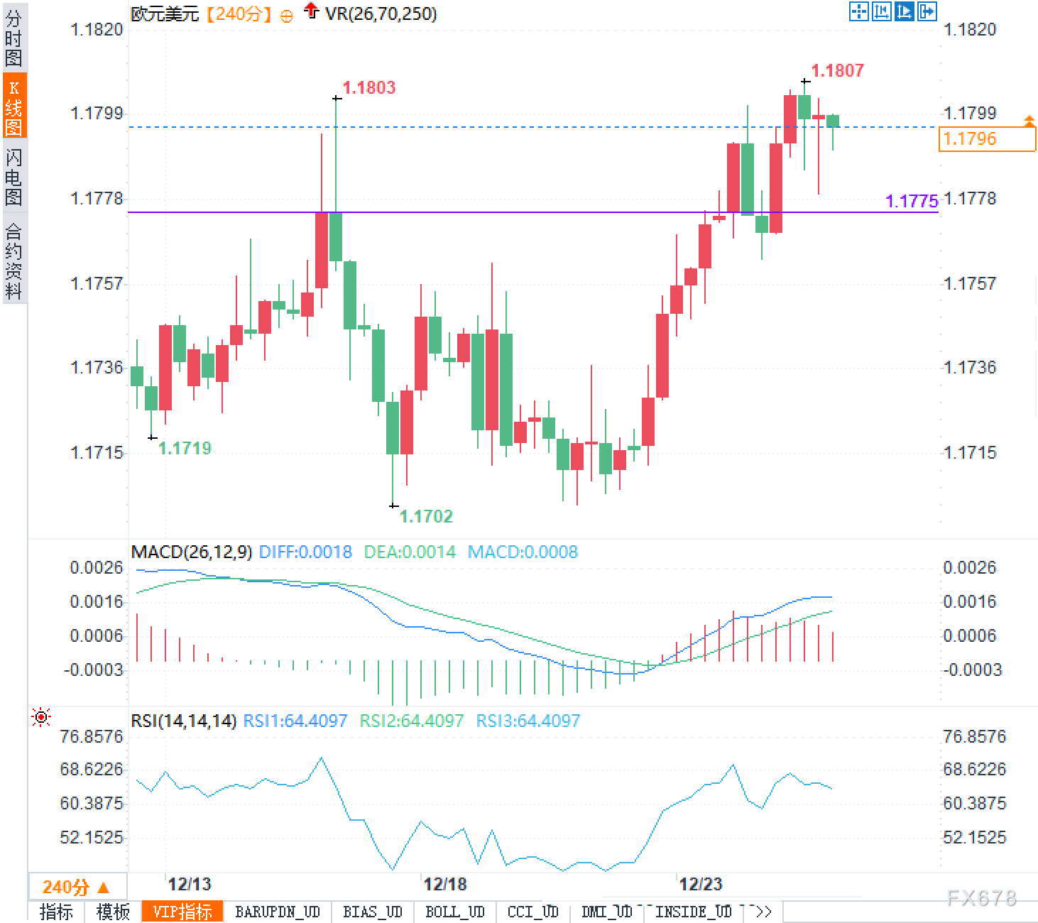 从240分钟图看,汇价自1.1702低点启动上升趋势,随后一路抬高低点并快速拉升至1.1807,高位出现连续小实体蜡烛图,典型的“上冲后整理”结构。眼下1.1800贴近前高密集区,向上首先关注1.1807的前高是否能形成有效突破;若突破缺乏量能与波动率配合,容易走出假突破并触发回撤。下方1.1775是关键水平支撑,既是前期突破后的回测位,也是一旦跌破就可能触发短线多头止盈的分水岭;更下方关注1.1750一带的成交密集区支撑,极端情况下1.1720与1.1702仍是本轮结构性支撑底座。