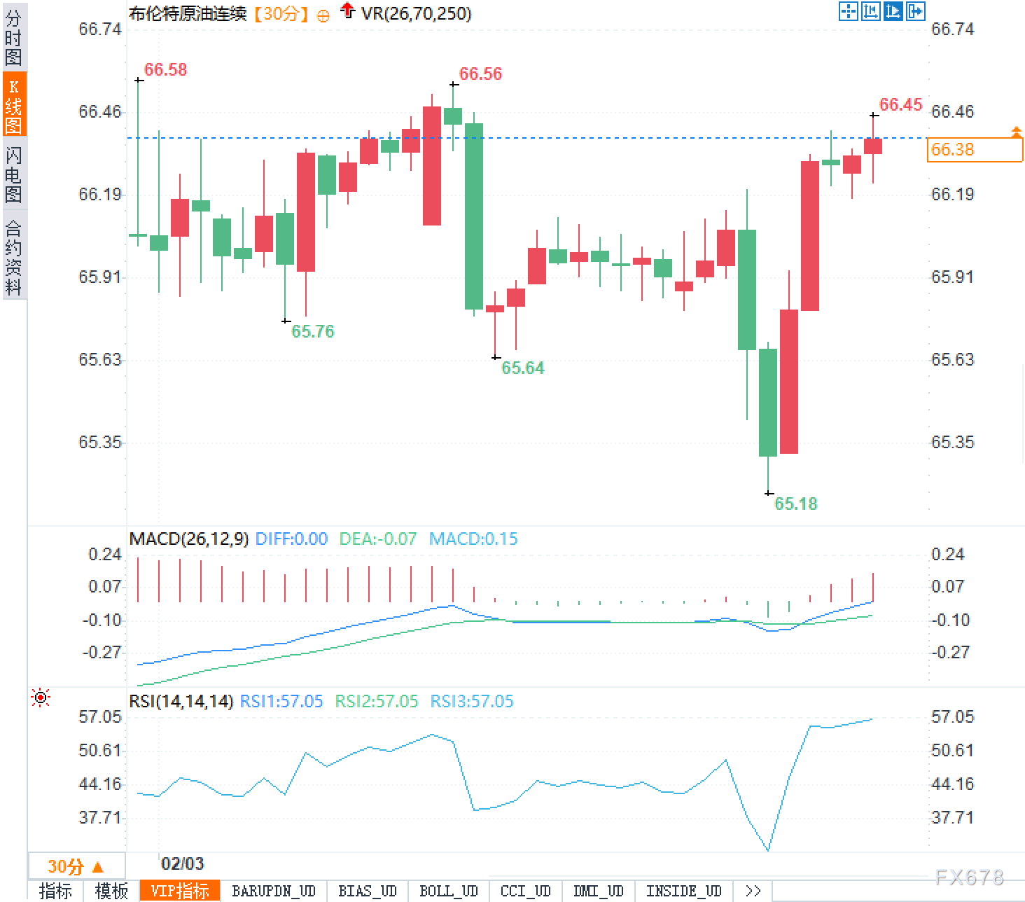 从盘面结构来看,布伦特原油正处在多空力量激烈博弈的阶段。30分钟级别图表上,近期高点分别出现在66.58、66.56和66.45附近,形成了一道密集的压力带。这意味着多头若想突破上行,必须有效消化这一区域的抛售压力,否则仍将面临反复震荡。