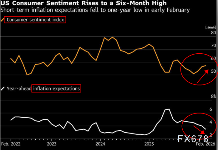 美国消费者信心数据呈现显著分化,对美元指数形成双向拉扯。密歇根大学数据显示,2月消费者信心指数初值从1月的56.4升至57.3,连续第三个月增长,创下六个月高点,超出55.0中位数预期。